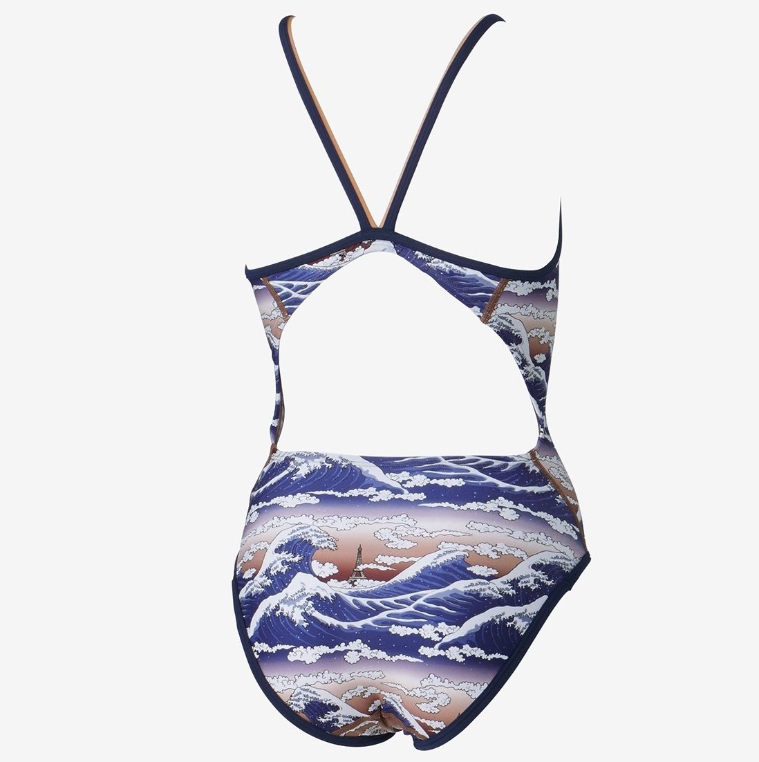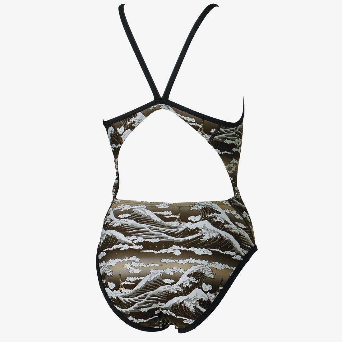 水抜けのよい大きな背穴。肩まわりの動きを妨げないV字の肩ストラップ。前身頃に裏地が付いています。別売りのカップを使用できるフック受けが付いています。
