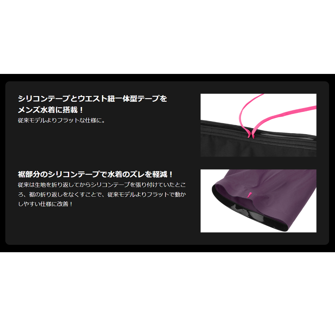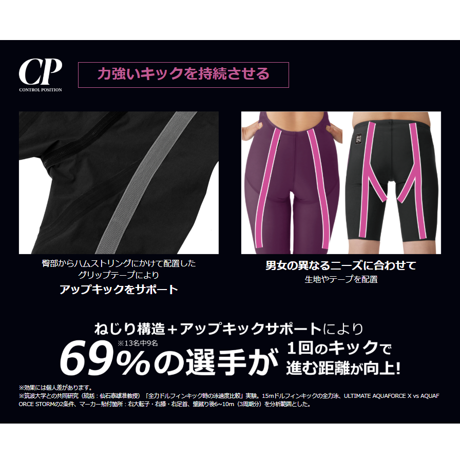 臀部からハムストリングスにかけて配置したグリップテープによるアップキックサポート。