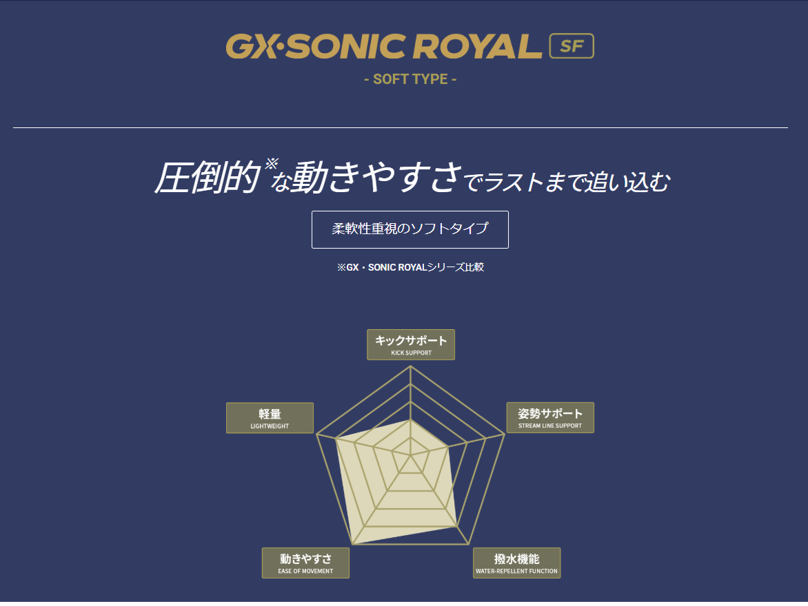 ■水中で軽量性を発揮するスリットナイロン構造の高撥水布帛(SONIC LIGHT RIBTEX-UW0)と、ホールド感の異なる布帛素材を組み合わせて設計されたトップレース水着 GX・SONIC ROYAL