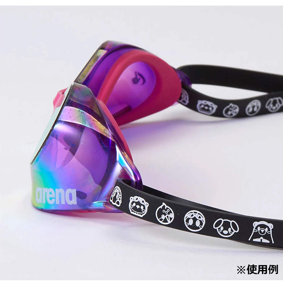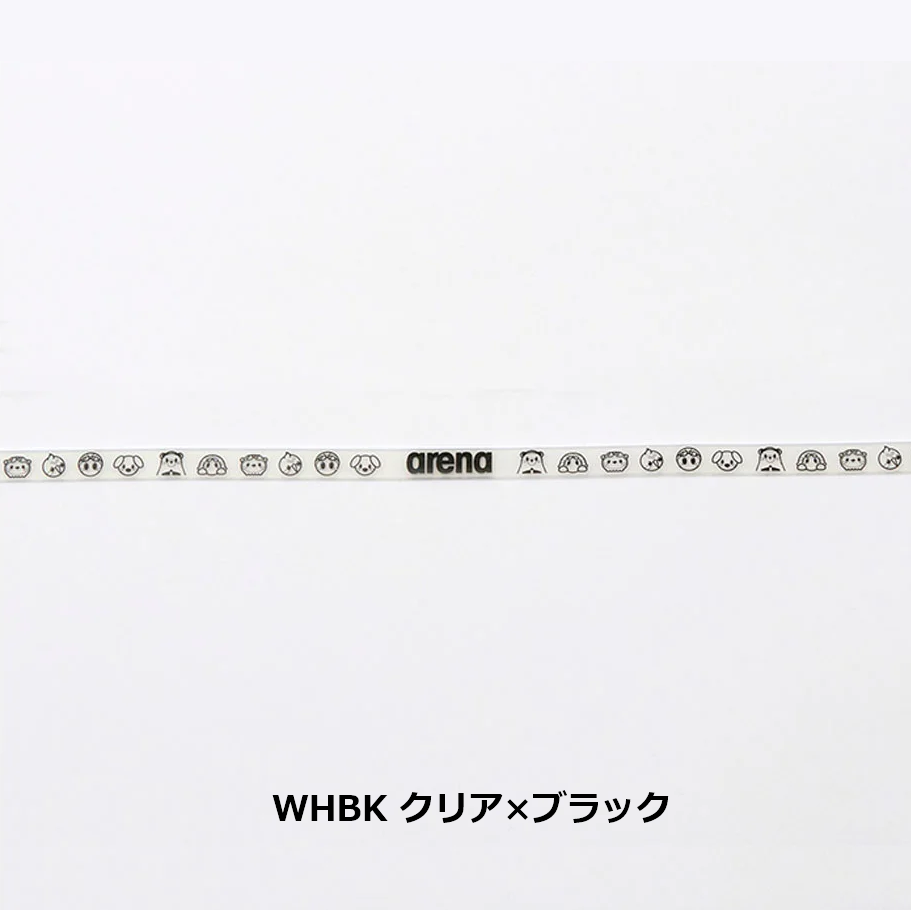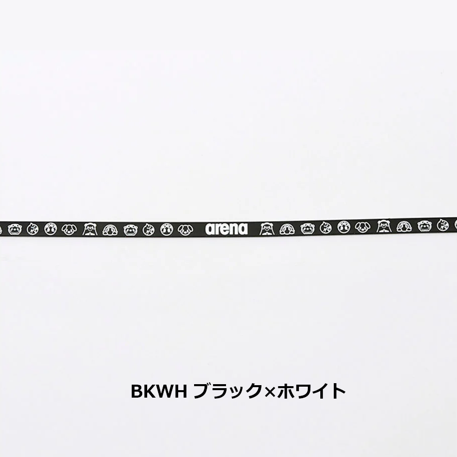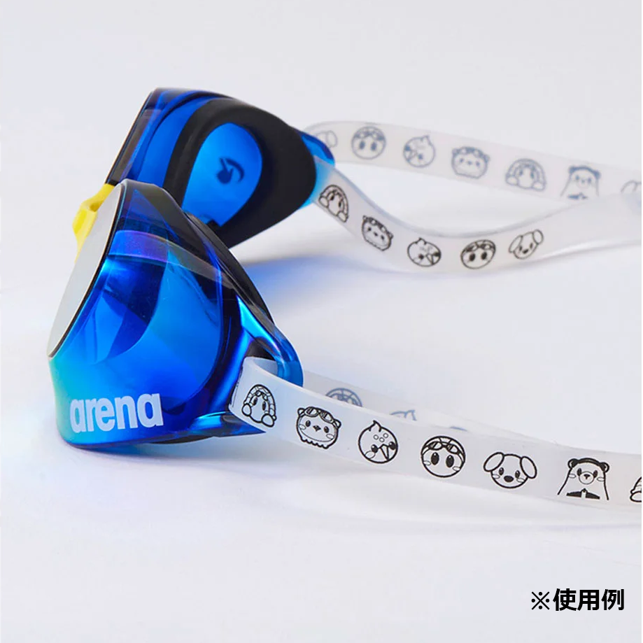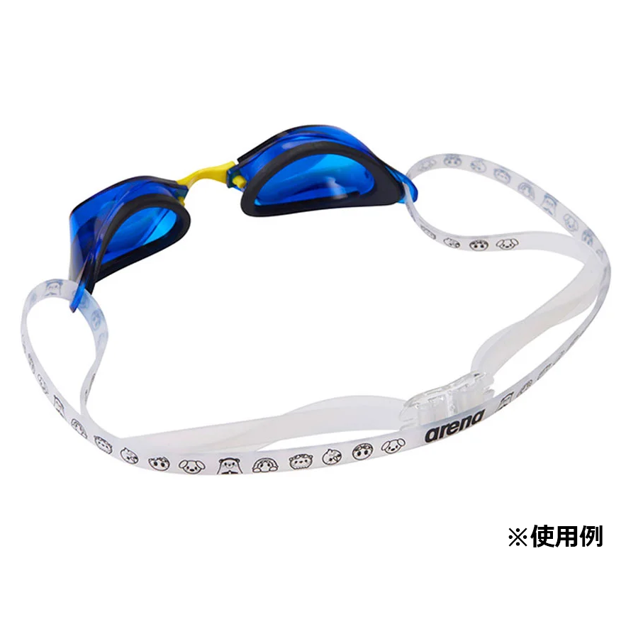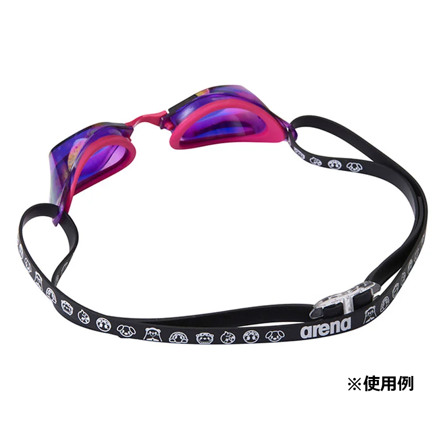 「アリーナくんと仲間たち」のデザインがプリントされたスイミングゴーグル用のベルト。アジャスター付き。